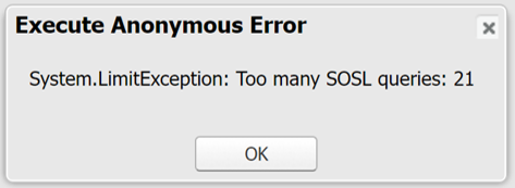 Solution: We need to reduce the number of SOSL queries per transaction within 20, as per the limit.